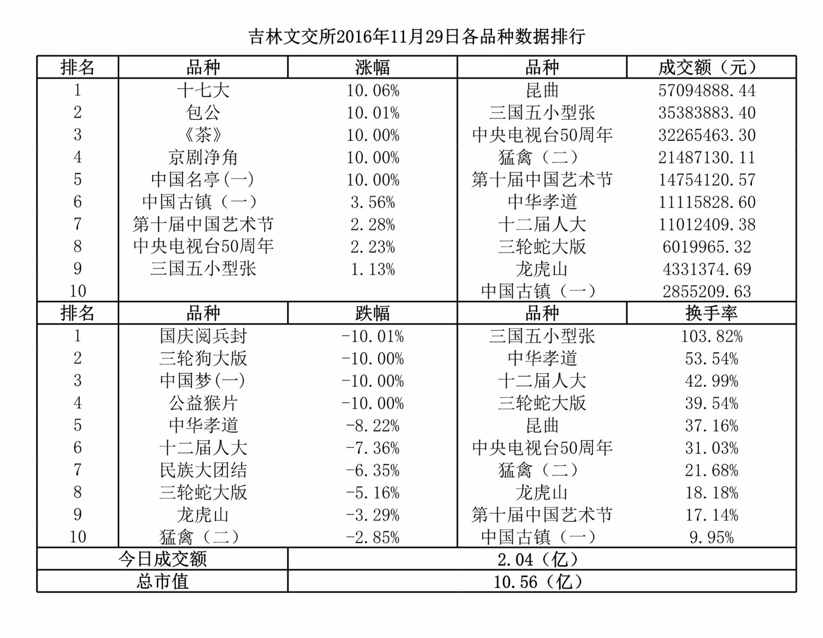 首页 交易中心 中心简介 组织架构 企业资质 活动专区 中心动态 信息披露 中心公告 交易公告 托管公告 入库公告 申购公告 中签公告 上市公告 交易数据 藏品目录 行业资讯 行业新闻 财经新闻 入市指南 开户流程 挂牌流程 托管流程 申购流程 交收流程 交易规则 银商绑定 常见问题 藏品百科 挂牌藏品 邮票 钱币 邮资封片 其他 权威机构 专家委员会 鉴定机构 交收仓库 公证机构 下载中心 相关资料下载 客户端下载 联系我们 您当前的位置:首页 > 信息披露 > 交易数据 返回列表 吉林文交所2016年11月29日各品种数据排行 发布时间:2016-11-30 08:46:35 信息来源: 浏览次数: 上一条:吉林文交所2016年11月28日各品种数据排行 下一条:吉林文交所2016年11月30日各品种数据排行 信息披露 中心公告 交易公告 托管公告 入库公告 申购公告 上市公告 交易数据 藏品目录 热点信息 吉林文交所2017年04月05日各品种数据排行吉林文交所2016年11月18日各品种数据排行吉林文交所2016年11月24日各品种数据排行吉林文交所2016年12月29日各品种数据排行吉林文交所2016年11月22日各品种数据排行吉林文交所2016年11月30日各品种数据排行吉林文交所2016年12月08日各品种数据排行吉林文交所2016年12月27日各品种数据排行吉林文交所2016年11月23日各品种数据排行吉林文交所2016年12月28日各品种数据排行 合作伙伴 中心简介|企业资质|组织架构|中心动态|活动专区|联系我们 通信邮箱:info@jlcaee-scp.com版权所有:吉林省文化产权交易所有限公司All Rights Reserved. Powered by吉ICP备14004752号-3
