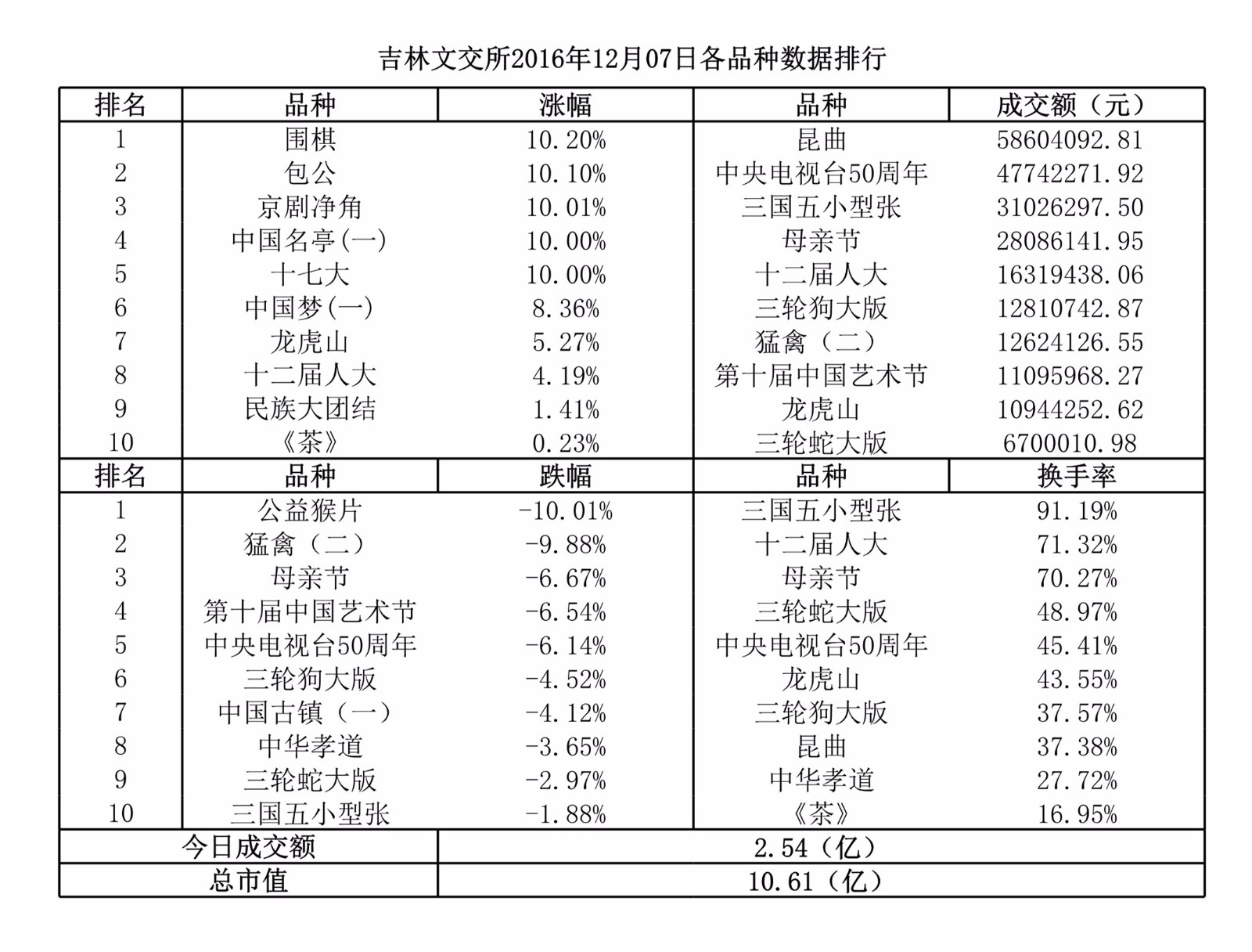 首页 交易中心 中心简介 组织架构 企业资质 活动专区 中心动态 信息披露 中心公告 交易公告 托管公告 入库公告 申购公告 中签公告 上市公告 交易数据 藏品目录 行业资讯 行业新闻 财经新闻 入市指南 开户流程 挂牌流程 托管流程 申购流程 交收流程 交易规则 银商绑定 常见问题 藏品百科 挂牌藏品 邮票 钱币 邮资封片 其他 权威机构 专家委员会 鉴定机构 交收仓库 公证机构 下载中心 相关资料下载 客户端下载 联系我们 您当前的位置:首页 > 信息披露 > 交易数据 返回列表 吉林文交所2016年12月07日各品种数据排行 发布时间:2016-12-08 08:49:51 信息来源: 浏览次数: 上一条:吉林文交所2016年12月06日各品种数据排行 下一条:吉林文交所2016年12月08日各品种数据排行 信息披露 中心公告 交易公告 托管公告 入库公告 申购公告 上市公告 交易数据 藏品目录 热点信息 吉林文交所2017年04月05日各品种数据排行吉林文交所2016年11月18日各品种数据排行吉林文交所2016年11月24日各品种数据排行吉林文交所2016年12月29日各品种数据排行吉林文交所2016年11月22日各品种数据排行吉林文交所2016年11月30日各品种数据排行吉林文交所2016年12月08日各品种数据排行吉林文交所2016年12月27日各品种数据排行吉林文交所2016年11月23日各品种数据排行吉林文交所2016年12月28日各品种数据排行 合作伙伴 中心简介|企业资质|组织架构|中心动态|活动专区|联系我们 通信邮箱:info@jlcaee-scp.com版权所有:吉林省文化产权交易所有限公司All Rights Reserved. Powered by吉ICP备14004752号-3