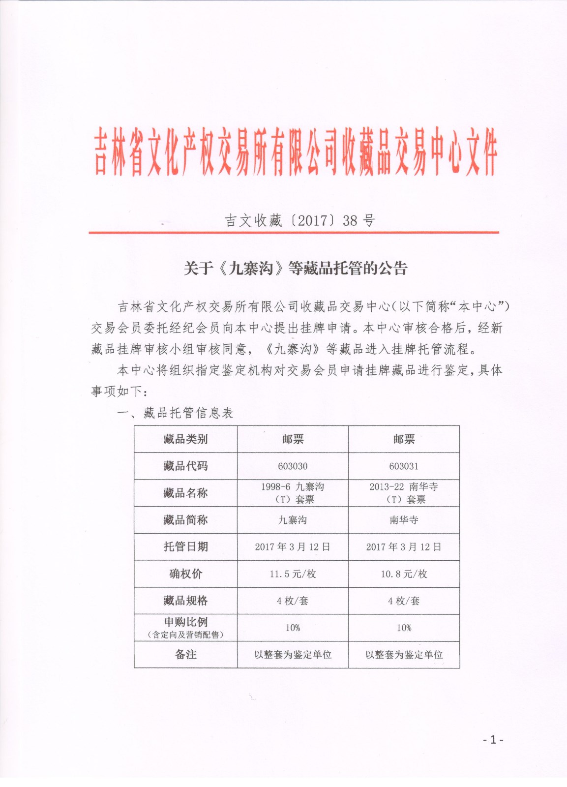 首页 交易中心 中心简介 组织架构 企业资质 活动专区 中心动态 信息披露 中心公告 交易公告 托管公告 入库公告 申购公告 中签公告 上市公告 交易数据 藏品目录 行业资讯 行业新闻 财经新闻 入市指南 开户流程 挂牌流程 托管流程 申购流程 交收流程 交易规则 银商绑定 常见问题 藏品百科 挂牌藏品 邮票 钱币 邮资封片 其他 权威机构 专家委员会 鉴定机构 交收仓库 公证机构 下载中心 相关资料下载 客户端下载 联系我们 您当前的位置:首页 > 信息披露 > 托管公告 返回列表 关于《九寨沟》等藏品托管的公告 发布时间:2017-03-11 13:29:42 信息来源: 浏览次数: 上一条:关于《海外中华情》等藏品托管的公告 下一条:关于《滨海新区小型张》等藏品托管的公告 信息披露 中心公告 交易公告 托管公告 入库公告 申购公告 上市公告 交易数据 藏品目录 热点信息 关于《金铜佛造像》等藏品托管的公告关于《钱塘江大潮》等藏品托管的公告关于《鸿雁传书》藏品托管的公告关于《孙子兵法》等藏品托管的公告关于《三十届奥运会》等藏品托管的公告关于《中国名亭(一)》等藏品托管的公告关于《九寨沟》等藏品托管的公告关于《海外中华情》等藏品托管的公告关于《京剧净角》等藏品托管的公告关于《滨海新区小型张》等藏品托管的公告 合作伙伴 中心简介|企业资质|组织架构|中心动态|活动专区|联系我们 通信邮箱:info@jlcaee-scp.com版权所有:吉林省文化产权交易所有限公司All Rights Reserved. Powered by吉ICP备14004752号-3
